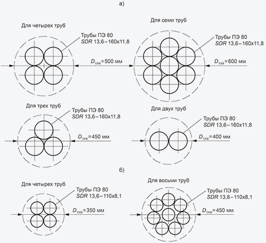 Закрытые переходы телефонных кабелей и волоконно-оптических линий (ВОЛС) кабелей связи методом ГНБ выполняются в предварительно протянутых вслед за расширителем полиэтиленовых трубах-оболочках (футлярах), соответствующих ГОСТ 18599 либо в металлических, неметаллических и композитных трубах, соответствующих ГОСТ Р МЭК 61386.24. При проколе и прокладке кабелей связи методом ГНБ используются футляры диаметром 40, 50, 63 и 90 мм.